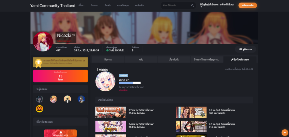 16. ระบบโปรไฟล์ Steam แบบใหม่ กำลังอยู่ระหว่างการทดสอบ! เราได้เพิ่มระบบโปรไฟล์ Steam แบบใหม่ โดยหากคุณต้องการทดสอบเพียงเชื่อมต่อบัญชีกับ Steam (หากเชื่อมต่ออยู่แล้ว เราได้โอนข้อมูลมาเรียบร้อยแล้ว) เชื่อมต่อบัญชี Steam ที่นี่ หลังจากนั้นคุณจะสามารถอัปเดตโปรไฟล์ได้ผ่านเมนูด้านขวา หากพบปัญหาใดๆ โปรดแจ้งเราทันที Nicezki Administrator of Yami Community 10 July 2019 19:54