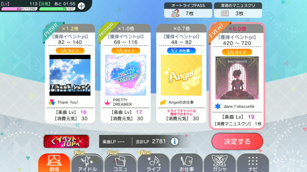 10. Platinum Star Tour ~ dans l'obscurité ~ ระยะเวลา: 23/7/19 @ 13:00 - 29/7/19 @ 18:59 UTC+7 ประเภทอีเว้นท์ Platinum Star Tour เพลงหลักของอีเว้นท์ dans l'obscurité Mizuki - Anna - Yuriko - Subaru - Roco วิธีการฟาร์ม *ระดับความยากเพลง ส่งผลต่อแต้มและโทเค็นอีเว้นท์ที่จะได้ (แนะนำ ) หน้าตาโทเค็นอีเว้นท์ 1. หา โทเค็นอีเว้นท์ เพื่อเล่นเพลงหลักของอีเว้นท์ * โทเค็นอีเว้นท์ เป็นสิ่งจำเป็นเพื่อเล่นเพลงอีเว้นท์ หากไม่มีจะเล่นเพลงหลักของอีเว้นท์ไม่ได้ 1.0 จากการเข้าหน้าอีเว้นท์ในทุกๆวัน วันละ 1 โทเค็นอีเว้นท์ 1.1 จากการเล่นเพลงในช่อง 1 หรือ 2 แนะนำช่อง 1 เพราะตัวคูณคะแนนเป็น x1.2 ข้อดี ได้ แต้มอีเว้นท์ นิดหน่อยเมื่อเล่นเพลง ข้อเสีย ใช้เวลานานต่อครั้งและเสียเวลาเล่นพอสมควร 1.2 ส่งไอดอลไปทำงาน ในช่องที่ 3 แนะนำมากกว่าการเล่นเพลงเพราะได้ โทเค็นอีเว้นท์ ไวกว่า ข้อดี ได้ โทเค็นอีเว้นท์ เร็วกว่า ข้อเสีย ได้ แต้มอีเว้นท์ น้อยกว่ามาก (x0.7) 2. รอจนกว่า ตัวคูณเพลงอีเว้นท์ เป็น x5.0 จึง กดเล่นเพลง * หากไม่ได้ 5.0 เลยให้ลองฟาร์ม โทเค็นอีเว้นท์ ไปเรื่อยๆ ตัวเกมจะปรับ 5.0 ให้เอง (อัตรายืนยัน) คำเตือนในหน้าหลักอีเว้นท์เมื่อ ตัวคูณเพลงอีเว้นท์ เป็น x5.0 หากไม่โหดด้านการกดสามารถใช้ ตั๋ว AUTO LIVE เพื่อเล่นเพลงหลักอีเว้นท์ในระดับความยาก MM ได้ โดยมีข้อแม้คือต้องพยายามเล่นให้ผ่านเพลงเพลงหลักอีเว้นท์ในระดับความยากนั้นๆก่อน 1 ครั้ง ตั๋ว AUTO LIVE ได้รับฟรีทุกวัน วันละ 1 ตั๋ว โดย ได้จาก การทำงาน หรือ เล่นเพลง เราสามารถเลือกที่จะใช้โทเค็นได้ตามต้องการต่อการเล่นหนึ่งครั้ง (สูงสุด 2 โทเค็นอีเว้นท์ ต่อครั้ง) และเมื่อเข้าสู่ช่วงท้ายๆของอีเว้นท์จะเป็น ช่วงปั่น โดยสามารถใช้โทเค็นได้คือ 3 โทเค็นอีเว้นท์ ต่อครั้ง แต้มอีเว้นท์ จะ คูณตามโทเค็นที่ใช้ไป โดยอยู่ระหว่าง 420 - 720 แต้มอีเว้นท์ ต่อ 1 โทเค็นอีเว้นท์ แต้มอีเว้นท์ มาตรฐานที่ควรทำได้ เพื่อรับการ์ดและชุดของอีเว้นท์คือ 30000 pt หากต่ำกว่านั้นจะได้ชุดหรือการ์ดไม่ครบ ระวังด้วยหล่ะ! ทีมที่ควรใช้คือ Fairy มีการแข่งขันในอีเว้นท์ 3 แบบ 1. แข่งขัน แต้มอีเว้นท์ 2. แข่งขัน คะแนนการเล่นเพลง (ไม่นับ AUTO LIVE) 3. แข่งขัน แต้มอีเว้นท์เลาจ์ ขอให้โชคดีในการเล่น หากมีคำถามเกี่ยวกับอีเว้นท์นี้สามารถถามมาได้เลยนะ -Nicezki อัปเดตสถานะเลานจ์และคะแนนอีเว้นท์ของเรา https://nicezki.ml/game/mirishita/