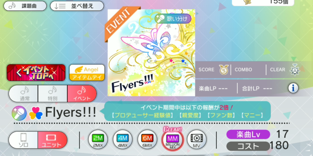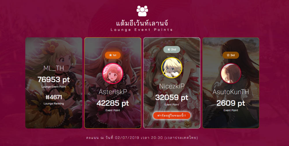 อีเว้นท์: UNI-ON@IR ระยะเวลา: 30/6/19 @ 13:00 - 13/7/19 @ 18:59 UTC+7 อีเว้นท์นี้ มีระยะเวลา 13 วัน คุณจะได้รับการ์ด 2nd Anniversary SR สูงสุด 4 การ์ดในทุกๆวันเมื่อสะสมแต้มครบที่กำหนดในแต่ละวัน ห้ามพลาดการล็อกอินหรือฟาร์มอีเว้นท์เด็ดขาดเลยนะ! เนื่องจากเราจะไม่ได้รับการ์ด SR พิเศษแบบทันที และต้องมานั่งตามฟาร์มเอาทีหลัง การ์ด SR แต่ละใบมาพร้อมกับชุดพิเศษ "Lumiere Papillon" หลังจบอีเว้นท์สามารถทำการ์ดเหล่านี้เป็น SSR+ จากภารกิจ เพลงประจำอีเว้นท์คือ "Flyers!!!" เล่นเพลงนี้ด้วย โทเค็นอีเว้นท์ ซึ่งจะได้รับจาก การเล่นเพลงใดก็ได้ คุณจะต้องเลือก ช่วงเวลาพัก ของคุณ ใน ช่วงเวลาพัก นี้ คุณจะ ไม่ได้รับโทเค็นอีเว้นท์ใดๆ ถึงแม้คุณจะพยายามอย่างไรก็ตาม หลังหมด ช่วงเวลาพัก คุณจะได้รับ แต้มบูสต์ มา 1 แต้ม (สะสมได้สูงสุด 2 แต้ม) ซึ่งเมื่อคุณกดใช้ โทเค็นอีเว้นท์ และ คะแนนอีเว้นท์ จะ เพิ่มขึ้นเป็นเท่าตัว เป็นเวลา 30 นาที เพลงที่แนะนำในการฟาร์มโทเค็นอีเว้นท์ ในช่วงเวลาบูสต์ คือ Sentimental Venus เนื่องจากเป็นเพลงที่สั้นที่สุด (1:52) ทางเลือกอื่นๆ Happy Darling (1:54) / Raise the FLAG (1:56) / Birth of Color (1:57) / Marionetteは眠らない (2:00) สำหรับแต่ละสาย Sentimental Venus (Fairy) , Birth of Color (Princess) , Happy Darling (Angel) การปั่นคะแนน ทั้งเซิฟเวอร์ มาถึงอีกครั้ง! หากคะแนนอีเว้นท์รวมของทั้งเซิฟเวอร์ถึง 5.2 พันล้านคะแนน ทุกคนจะได้รับตั๋วสุ่ม SSR แบบ Limited การกดปุ่ม 衣装配布 ในหน้าอีเว้นท์จะทำให้คุณเลือกไอดอลหนึ่งคนเพื่อรับชุดก่อนได้ทันทีโดยไม่ต้องรอการ์ด SR รายวัน ขั้นตอนการฟาร์มที่แนะนำ ทำงานเพื่อรับ ตั๋วไลฟ์ x500 (ก่อนบูสต์) เปิดบูสต์คูณ 30 นาที เล่นเพลงที่แนะนำด้วย ตั๋วไลฟ์ x450 (จากการทำงาน) เล่นเพลง Flyers!!! รัวๆจน โทเค็นอีเว้นท์ หมด ขอให้โชคดีในการเล่น หากมีคำถามเกี่ยวกับอีเว้นท์นี้สามารถถามมาได้เลยนะ -Nicezki อัปเดตสถานะเลานจ์และคะแนนอีเว้นท์ของเรา https://nicezki.ml/game/mirishita/