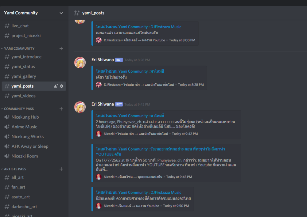 8. Alpha 2.1907.001 เพิ่มเข้ามาแบบทดลองใช้งาน โย่ว! นี่มัน Steam นี่หว่า (10 กรกฎาคม 2019 - ปัจจุบัน) เราได้เปิดการทดสอบระบบแสดงสถานะการเล่นเกมบน Steam (หากเชื่อมต่อไว้) ดิสสสสสสสสสสสสสสคอดดดดดด!! (1 กรกฎาคม 2019 - ปัจจุบัน) คุณสามารถล็อกอินด้วย Discord และมีระบบเชิญแบบพิเศษจาก Yami Community (หากกดเข้าผ่านเว็บจะได้ยศ Yami Pass ใน Discord) นอกจากนี้โพสต์ รูปภาพ วีดีโอ การแนะนำตัวต่างๆ ยังไปโชว์ใน Discord อีกด้วยนะ มาคุยกันเถอะพวกเรา (13 กรกฎาคม 2019 - 2 สิงหาคม 2019) ยกเลิกการใช้งานเมื่อ 2 สิงหาคม 2019 เนื่องจากพบปัญหาซึ่งถูกแจ้งโดย @Phunyavee_ch. แชทถูกปรับเป็นระบบใหม่แล้ว สามารถเห็นคนที่ออนไลน์ ใส่วีดีโอ Youtube หรือภาพได้ด้วยนะ! นอกจากนี้แชทนี้จะโผล่ขึ้นในแทบทุกหน้าเลยหล่ะ ทำให้เห็นข้อความได้เร็วขึ้นและไม่พลาดข้อความใหม่ๆ และแน่นอน เสียงเตือนการแชทแบบใหม่ ปรับเปลี่ยน นานไปแล้วๆ รอกันรากงอกเลย (21 กรกฎาคม 2019) เวลาการป้องกันสแปมโพสต์ถูกลดลงสำหรับ Class ยังไม่ได้รับการยืนยัน 1 ชั่วโมง/โพสต์ 15 นาที/โพสต์ มันดูแปลกๆไหมนะ? (1 กรกฎาคม 2019) เลย์เอาท์หน้าหลักถูกปรับใหม่เล็กๆน้อยๆ แก้ไขบั๊ก เออเร่อ เออเร่อ 403 เมื่อกดตั้งกระทู้แล้วจะปรากฎหน้า 403 Error ทำให้ไม่สามารถตอบหรือตั้งกระทู้ได้เลย ลบออกไป ระบบการล็อกอิน Steam แบบเก่า ระบบการล็อกอิน Discord แบบเก่า แชทแบบเก่า