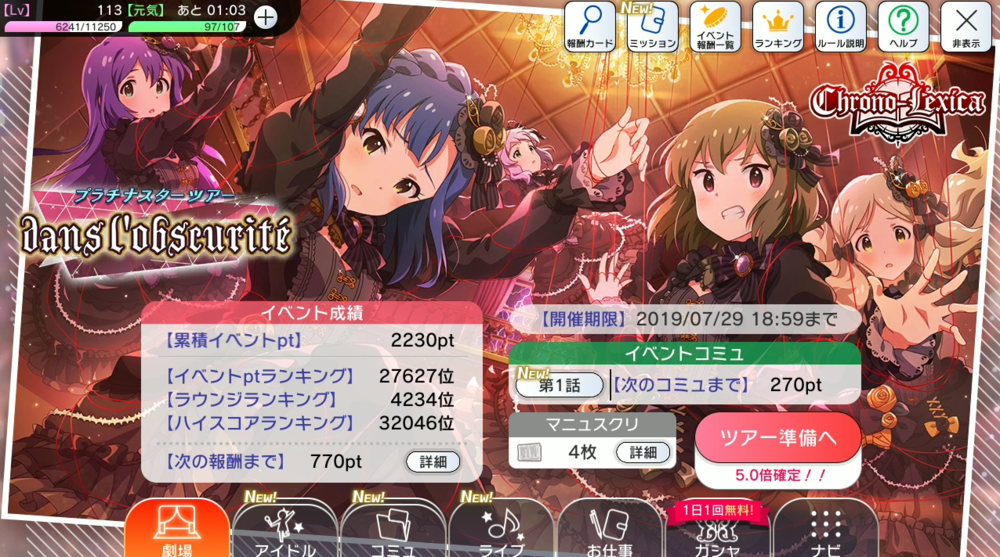 อันดับ รางวัล 1-100 SR (Chrono-Lexica) Yuriko Nanao R4 แบนเนอร์ระดับ Platinum dans l'obscurité Top Ranker ตั๋วอัพ SR x5 500 เพชร 101-2500 SR (Chrono-Lexica) Yuriko Nanao R4 แบนเนอร์ระดับ Platinum dans l'obscurité Platinum Ranker ตั๋วอัพ SR x4 500 เพชร 2501-5000 SR (Chrono-Lexica) Yuriko Nanao R3 แบนเนอร์ระดับ Gold dans l'obscurité Gold Ranker ตั๋วอัพ SR x4 250 เพชร 5001-10000 SR (Chrono-Lexica) Yuriko Nanao R2 แบนเนอร์ระดับ Silver dans l'obscurité Silver Ranker ตั๋วอัพ SR x3 150 เพชร 10001-20000 SR (Chrono-Lexica) Yuriko Nanao R1 แบนเนอร์ระดับ Bronze dans l'obscurité Bronze Ranker ตั๋วอัพ SR x2 100 เพชร 20001-50000 SR (Chrono-Lexica) Yuriko Nanao ตั๋วอัพ SR x1 100 เพชร 50001-1000000 ตั๋วอัพ R x5 50 เพชร